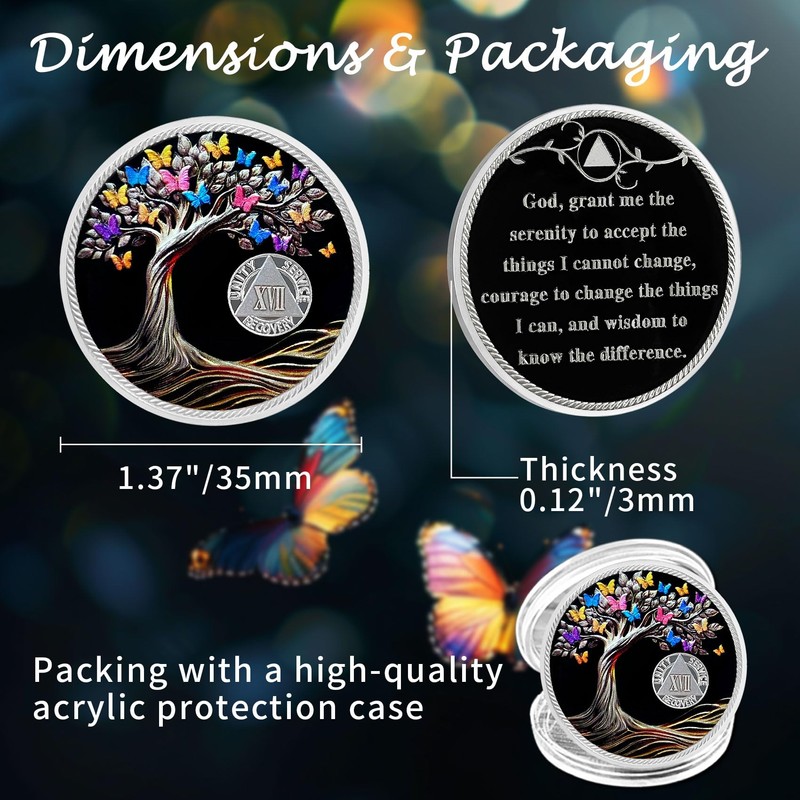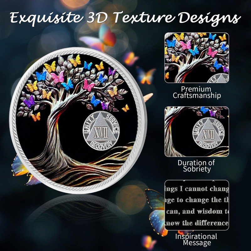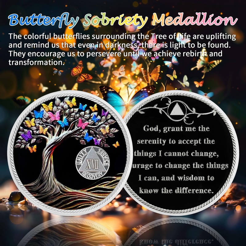 - Celebrate 17 Year of Sobriety: The sobriety medallion is a perfect symbol of celebrating 17 Years of sobriety. The aa coin features a meaningful and inspiring design, depicting an intricate and sturdy Tree of Life surrounded by vibrant colorful butterflies. This vivid and beautiful scene is uplifting, reminding us that even in darkness, light can be found, encouraging us to persevere until we achieve rebirth and transformation - the journey from pain to hope in recovery