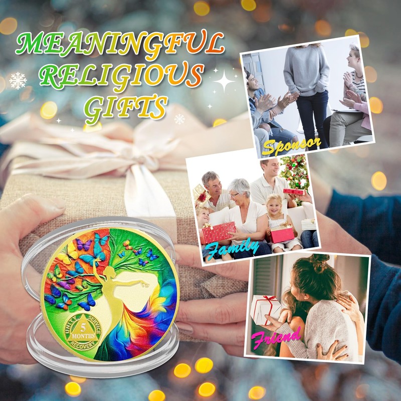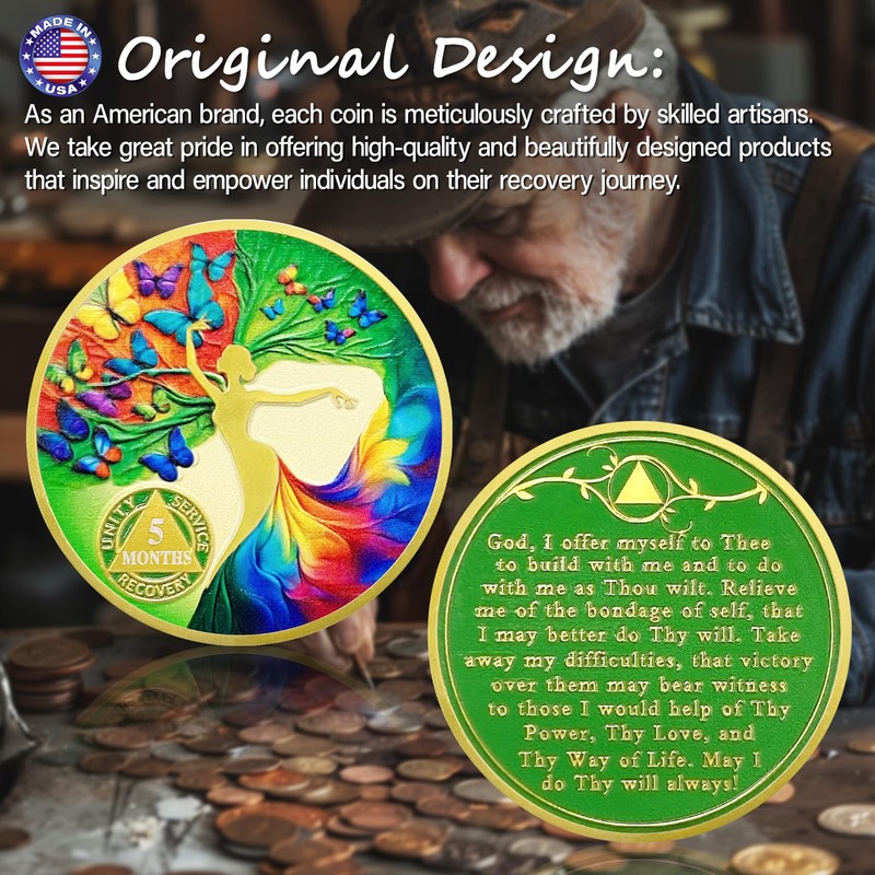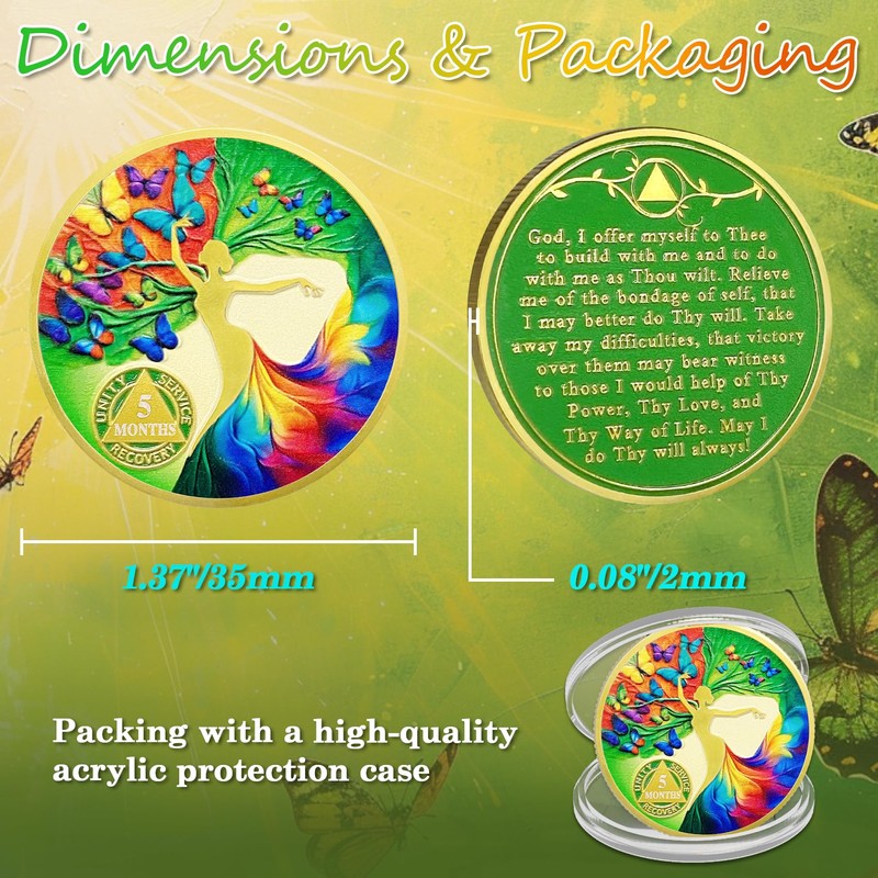 - Celebrating 5 Month of Sobriety: The medallion is the perfect symbol for 5 months of sobriety. It features a vibrant artistic pattern of a woman dancing abstractly transformed into a tree of artistic life, surrounding by colorful butterflies, symbolizing liberation, rebirth and transformation .This vibrant scene represents the journey of the recovering individual regaining freedom and hope from adversity. and inspires continued on their path to recovery