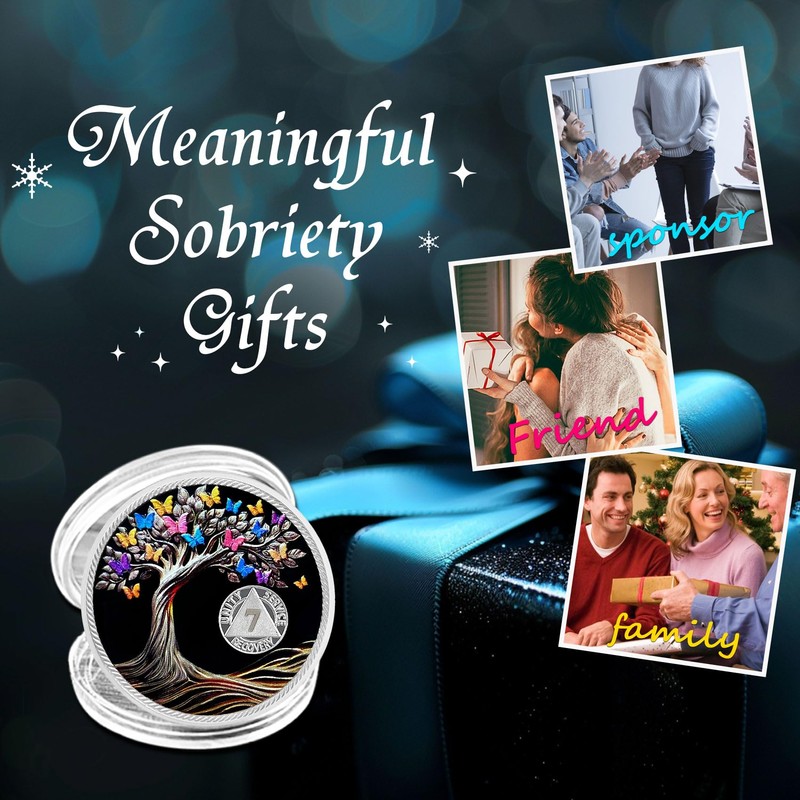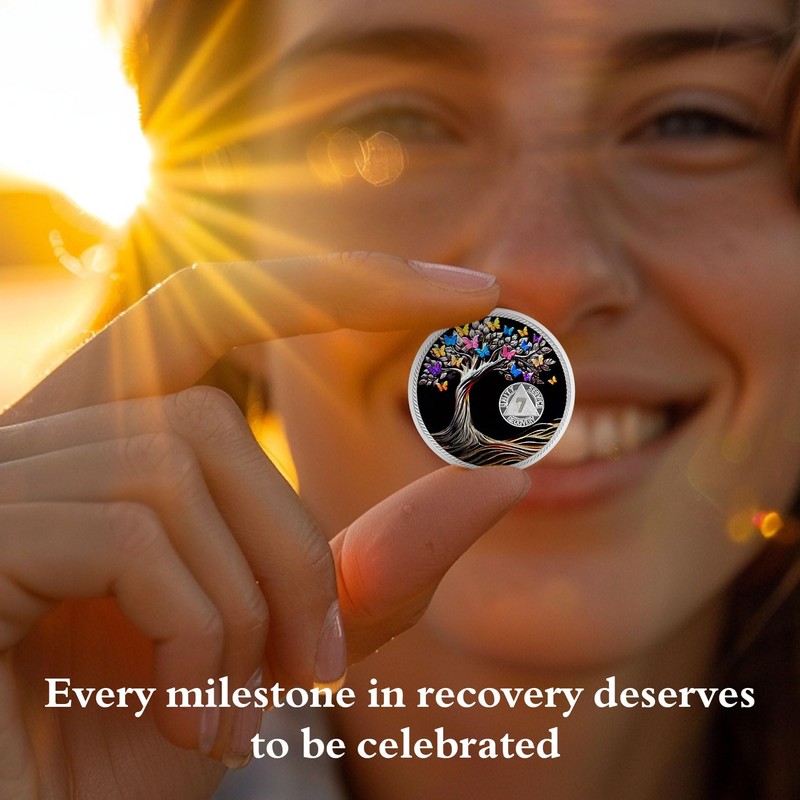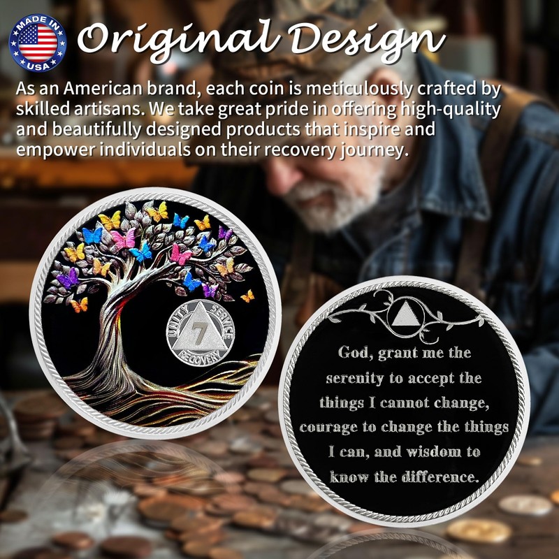 - Celebrate 7 Month of Sobriety: The sobriety medallion is a perfect symbol of celebrating 7 months of sobriety. The aa coin features a meaningful and inspiring design, depicting an intricate and sturdy Tree of Life surrounded by vibrant colorful butterflies. This vivid and beautiful scene is uplifting, reminding us that even in darkness, light can be found, encouraging us to persevere until we achieve rebirth and transformation - the journey from pain to hope in recovery