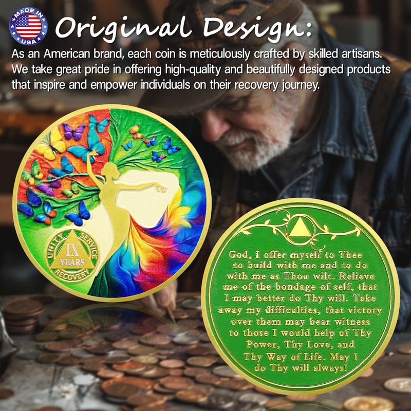 • Celebrating 9 Year of Sobriety: The medallion is the perfect symbol for 9 years of sobriety. It features a vibrant artistic pattern of a woman dancing abstractly transformed into a tree of artistic life, surrounding by colorful butterflies, symbolizing liberation, rebirth and transformation .This vibrant scene represents the journey of the recovering individual regaining freedom and hope from adversity. and inspires continued on their path to recovery
