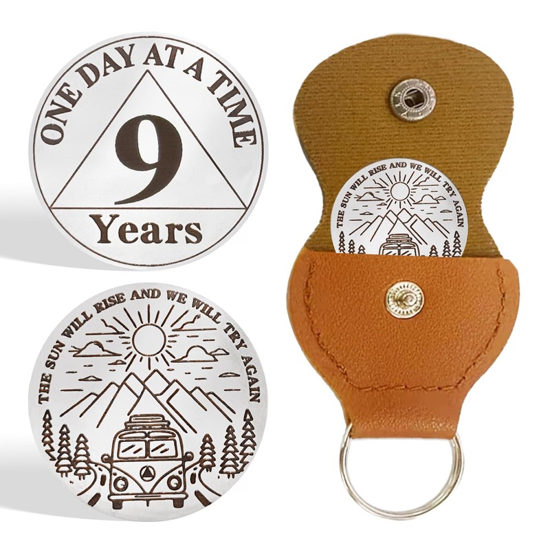 IELCJJ 1 to 20 Years Triplate Sobriety Coin - One Day At A Time Sobriety Token - Triplate AA Cions and Medallions - Alcoholics Anonymous Recovery Gifts for Men Women Sober Chip with PU Leather Keychain < br >< br > Celebrating Sober Journey < br > The ONE DAY AT A TIME medallion encourages individuals to focus on the present and maintain their sobriety daily. “STAY STRONG, STAY SOBER. I’m proud of you” motivates people to keep going and fulfill their commitment to sobriety. The coin serves as a source of ongoing motivation and boosts confidence in one’s ability to stay sober. Each day of sobriety is a victory!< br > Sobriety coins size is about 1.18"(30mm) in diameter and 0.08"(2mm) in thickness, each keychain approximately 1.93" x 2.72" (49 x 69 mm). < br > Crafted from high-quality stainless steel and featuring an iron-plated silver finish< br > Each coin comes with a high-quality PU Leather Keychain < br > Perfect for pocket, wallet or coin clip keychain,serving as a daily reminder of your journey.< br >< br > Front Design: AA coin features the motivational words: “ONE DAY AT A TIME,” and the Three Legacies Motto, “Recovery, Unity, Service,” and the sobriety length marks personal commitment and achievement.< br > Back Design: AA medallion features a vintage van driving on a road through a pine forest, symbolizing the journey of sobriety. The background depicts rolling mountains and a rising sun, representing new beginnings and hope. Along with the Inspiring words "THE SUN WILL RISE AND WE WILL TRY AGAIN" .< br > Range of Years: < br >1 to 12 months/1 to 20 years< br >< br > Meaningful Sobriety Gifts for Women Men< br >< br > Whether you are looking for recovery gifts for men and women or a sponsor's AA gift, this recovery coin is the perfect sobriety gift. Non-religious and universally supportive, the sobriety chips are not limited to members of Alcoholics Anonymous; they make a thoughtful gift for anyone in recovery."