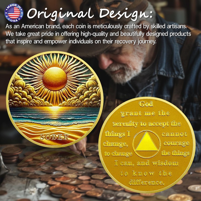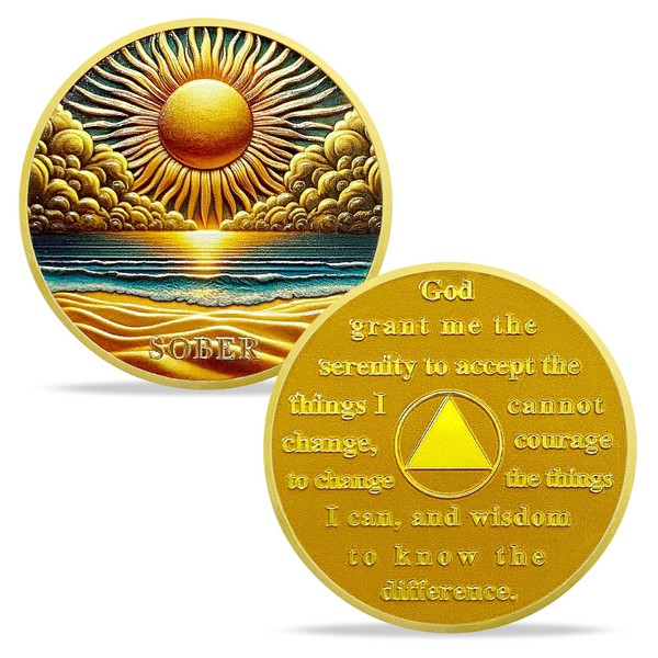 - Celebrating of Recovery: The sobriety coin features an inspiring and artistically vibrant golden beach scene. A radiant sun hangs high in the sky, while the tranquil sea and sands glisten in the sunlight, conveying warmth and comfort. This serene landscape symbolizes the journey of those in recovery, reclaiming freedom and hope from adversity, and inspires them to continue on their path to recovery