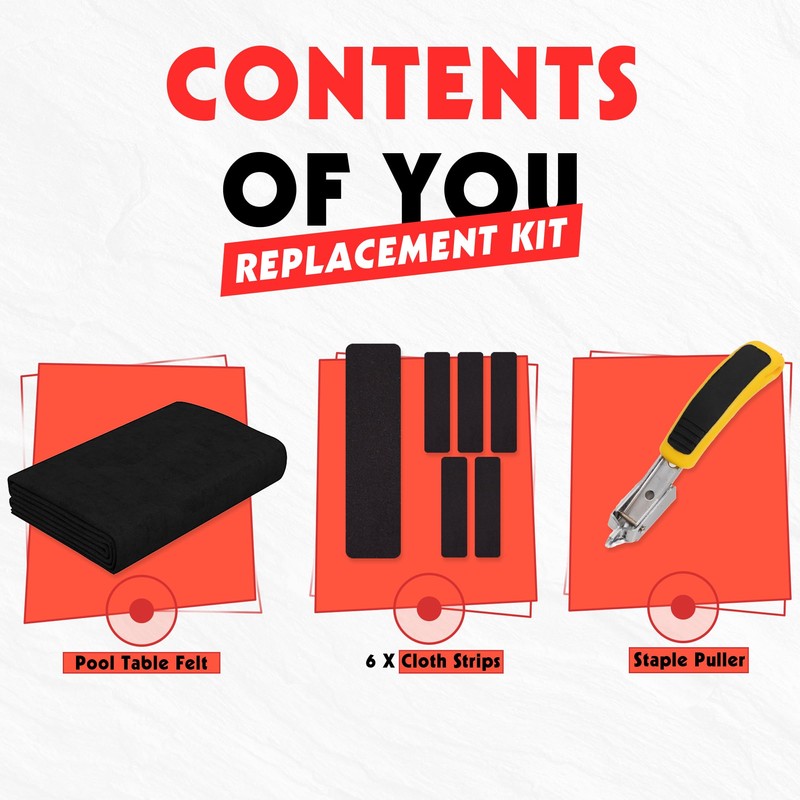 - 【Contents of replacement kit】1 X 8.5FT Pool Table Felt,6 X Cloth Strips, 1 X Staple Puller