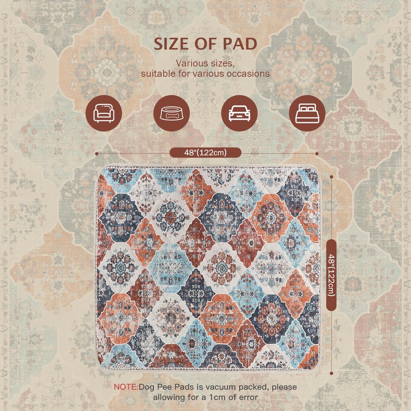 - 【Fashionable and Non-Slip】Our bohemian-print design adds a natural touch to the potty pads for dogs, giving your room a warm, casual vibe. And the non-slip bottom design makes the pet pee pads can achieve a certain fixed effect, you can put it anywhere you want. Soft and non-slip material makes it safer for dogs to use the pads.