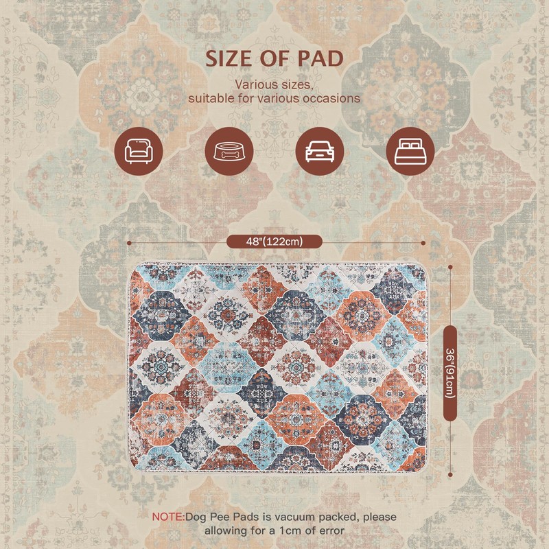 - 【Fashionable and Non-Slip】Our bohemian-print design adds a natural touch to the potty pads for dogs, giving your room a warm, casual vibe. And the non-slip bottom design makes the pet pee pads can achieve a certain fixed effect, you can put it anywhere you want. Soft and non-slip material makes it safer for dogs to use the pads.