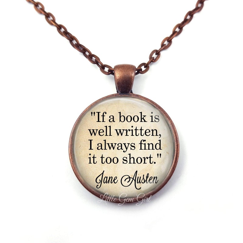 If a book is well written, I always find it too short Jane Austen Quote Necklace Pendant or Key Chain Charm - Book Lover Classic Novel Gifts