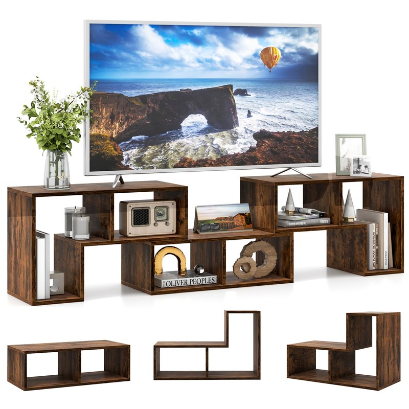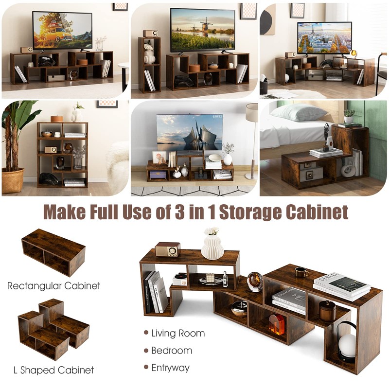 - Free Combination Design: This deformable TV stand comes with 2 L-shaped shelve (26.5" L x 12" W x 17" H)and a rectangular shelf(26.5" L x 12" W x 8.5" H), allowing you to combine and customize the shelves in various layouts to suit your space and style preferences. Tabletop expandable from 53" to 67".