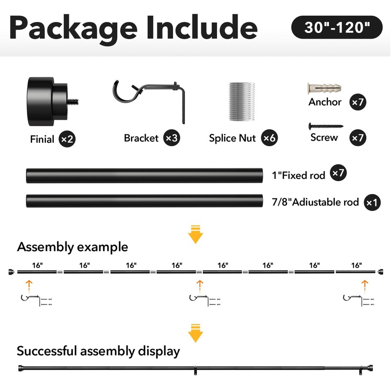 - 【Adjustable Non-Bending Curtain Rods】Our black curtain rods adopt a new upgraded structure: connect each curtain rod with splice nuts. And we have lengthened the length of the splice nut and the precision is very high, So screw together is smooth, and there will be no jamming at all. Compared with other structures, our curtain rods is stronger and more durable. After the installation is complete, the curtain rod is straight like one tube, and will not bend in the middle.