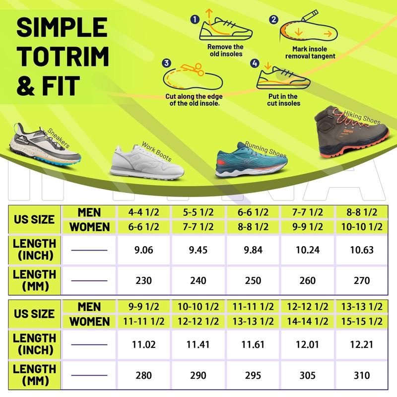- Tips: Before you buy the product, please check the size of the insoles carefully and choose the right size to improve your foot health. Our products are suitable for most shoes, and the insoles function as foot protection in different types of shoes. In addition, we have equipped the insoles with a cuttable line so that the insoles fit perfectly to your feet for the best results.