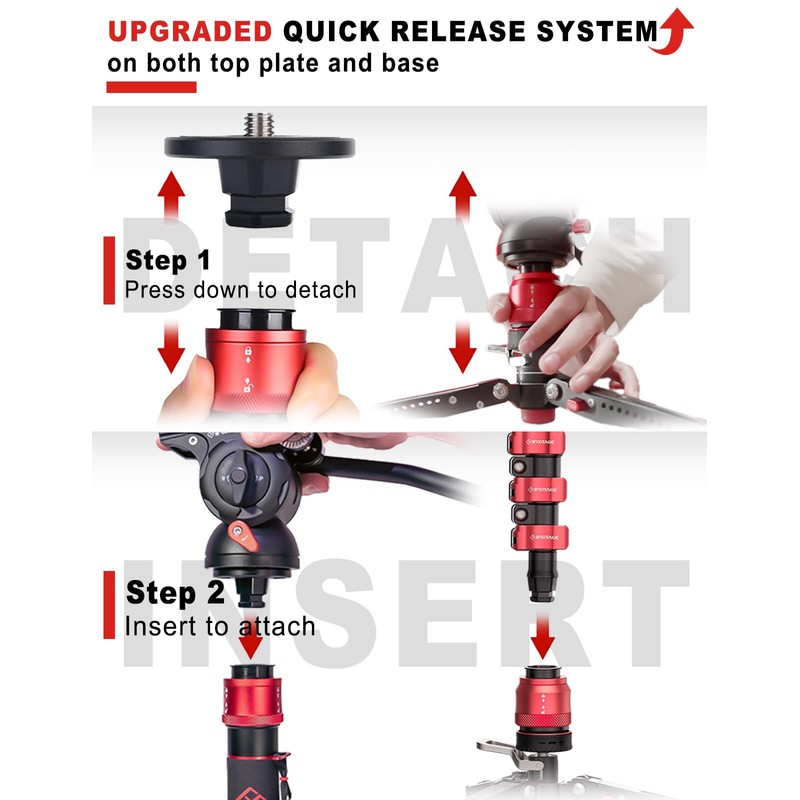 • ⭐【Video Monopod with Quick Release Head】: Press the sleeve to release the top plate / insert the top plate to install your device. 2 steps switching different devices in seconds.