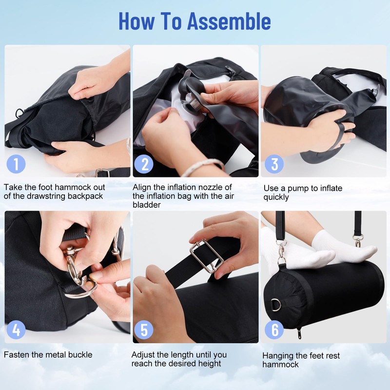 Say goodbye to discomfort and leg fatigue with our airplane foot hammock, carefully crafted to offer you the perfect blend of support and relaxation, the leg rest for airplane travel larger size ensures maximum comfort, while the slow rebound feature allows you to sink into a state of blissful tranquility. the enhanced breathability ensures that your feet stay cool and dry throughout your journey, making this foot rest a must-have for airplane travel essentials. Compact and portable, this inflatable foot rest airplane is the perfect travel companion for your next adventure, whether you're flying for business or pleasure, this travel foot rest for airplane flights will take your travel experience to new heights