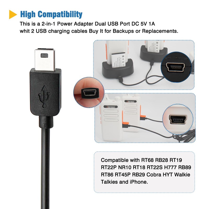 - ► RT22 2-in-1 Power Adapter and 2 USB charging cables are available Compatible with RT68 RB28 RT19 RT22P NR10 RT18 RT22S H777 RB89 RT86 RT45P RB29 Cobra HYT Walkie Talkies and iPhone.