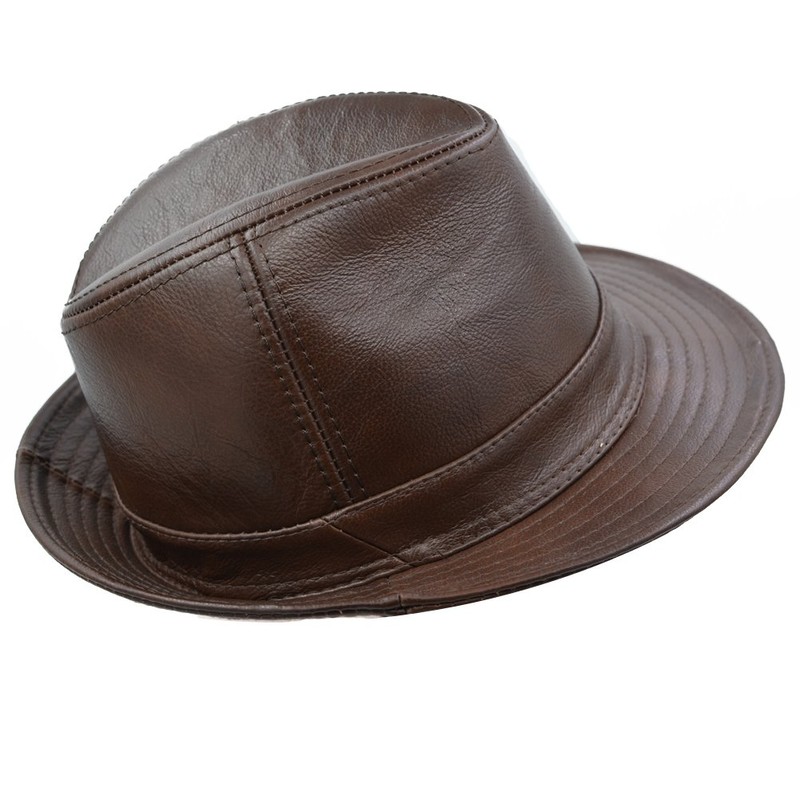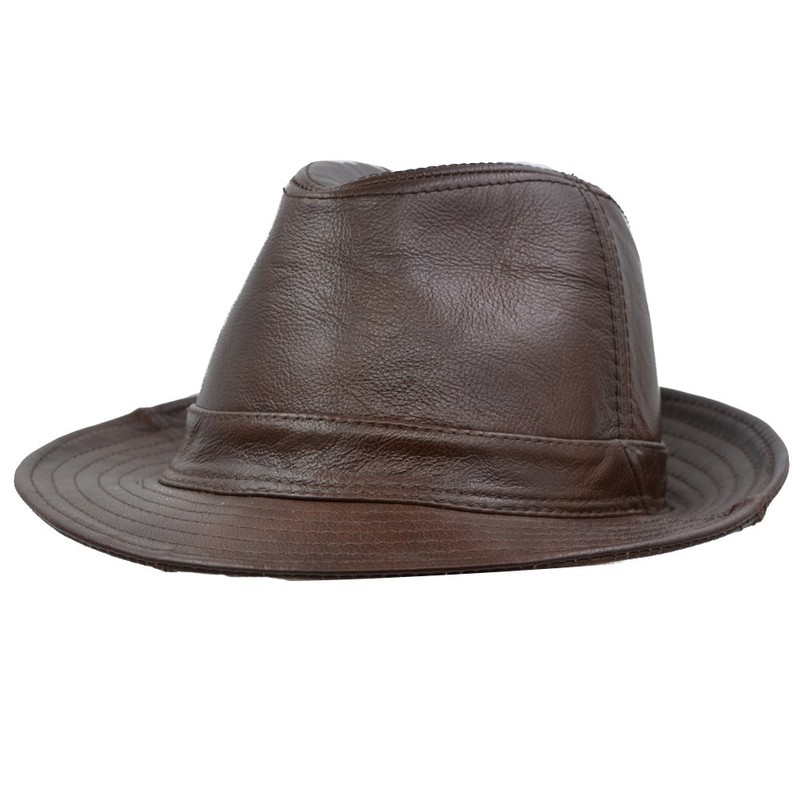 IFSUN Men & Women's Cowhide Jazz Hat Short Brim Leather Fedora Hat, Brown, X-Large