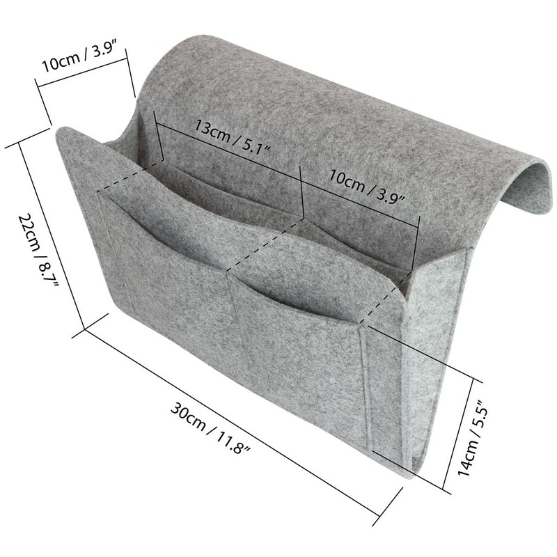- The size of the bedside storage organiser is: 30 cm x 22cm x 10cm (11.8" x 8.7" x 3.9"), weight 127g (4.5oz). The bed pockets storage is made from thick felt in colour grey