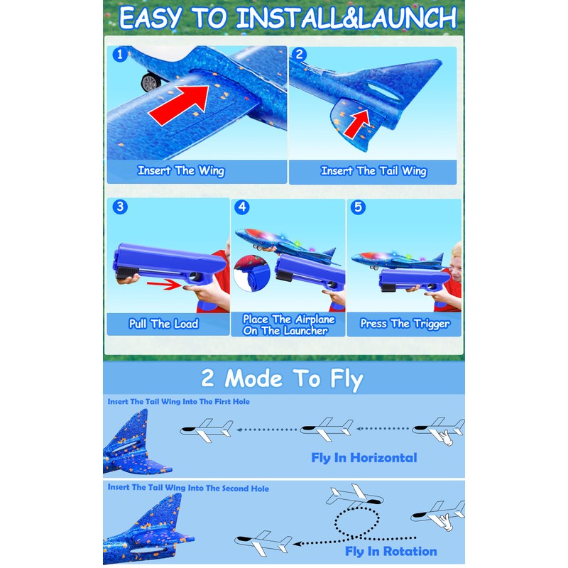 - [3 Glowing Modes] The airplane toys are equipped with built-in colorful LED lights and batteries, offering 3 flashing modes: steady, slow flash, and fast flash. Suitable for both day and night play, these planes will create a light show when launched into the night sky. With two play options, you can either use the launcher or hand-throw the planes.
