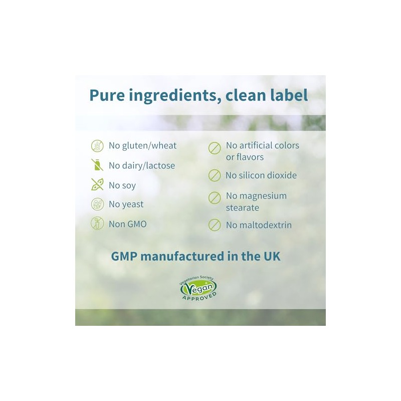 - PURE & CLEAN: lab-verified ingredients; UK GMP manufactured; vegan; no silicon dioxide or magnesium stearate; fully recyclable packaging; easy-to-swallow oval tablets