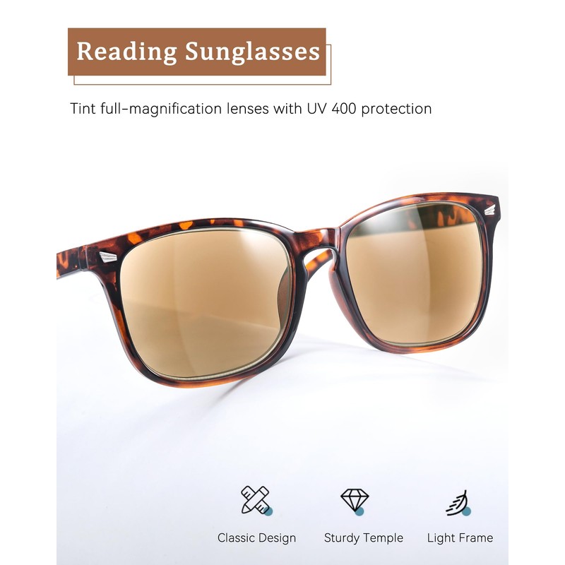 - Full UV400 Protection Reading Sunglasses: The lenses provide strong protection from potentially damaging sun rays with full-spectrum UVA and UVB protection. By blocking full of harmful UVA and UVB radiation, the lenses help safeguard the eyes from short-term and long-term damage caused by overexposure to the sun's rays.