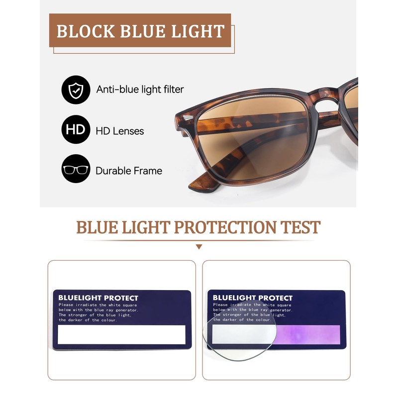 - Blue Light Blocking: Blue Light Blocking: These reading sunglasses can reduce harmful blue light. The color-tinted lens can improve contrast, reduce chromatic aberrations, and alleviate eyestrain and headaches caused by using electronic devices (computers, phones, tablets, LED, etc.) while sunbathing.