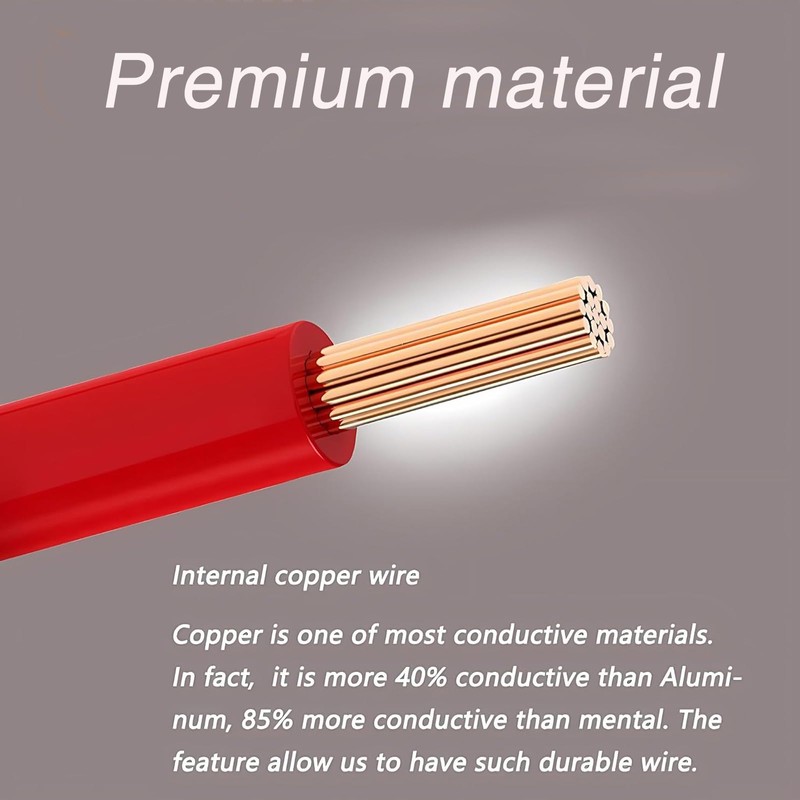 • Durable Construction: Made from high-quality materials, Copper is one of most conductive materials. In fact, it is more 40% conductive than Alumi- num, 85% more conductive than mental. The feature allow us to have such durable wire.