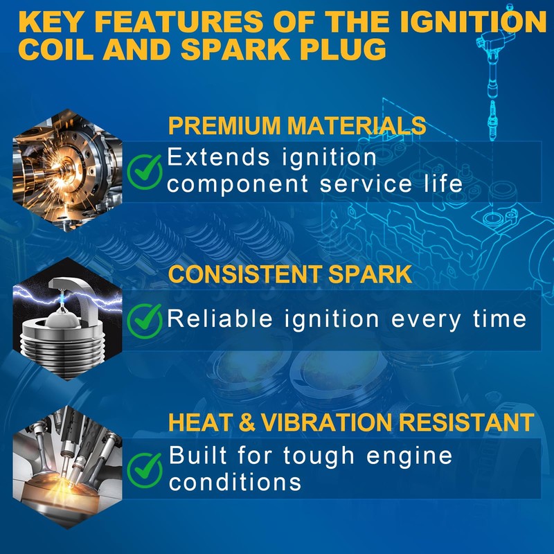 - 【Reliable Ignition Performance】 Engine starting issues, misfires, and rough idling are often caused by worn ignition parts. This coil and spark plug set restores strong spark delivery, ensuring smoother startups and consistent power