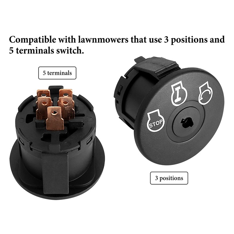 - 3. The generic ignition switch is ideal for many different brands of mowers with 3 positions and 5 terminals. The positions from left to right (turning key clockwise) refer to stop, run/on and crank.