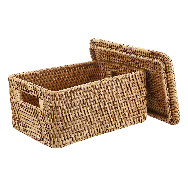 - Portable rattan shelving Baskets- The opend bakset come with a cover that allow you hide the items. The rattan basket each has a handle on the sides. This allows them to easily be taken out of the cupboard or off the shelf and carried from room to room