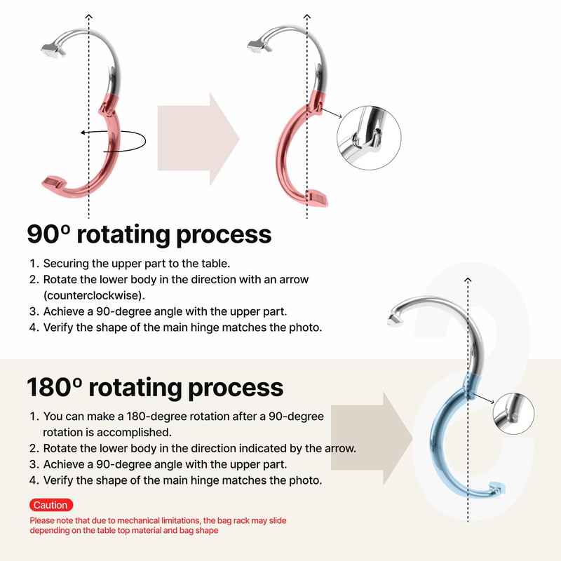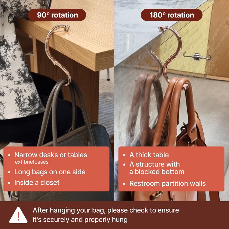 - Versatile Functionality: In a tight space, this hanger can be adjusted to keep your bag safe and secure. On a ‘thin desk,’ hang it in a 'C-shape' to keep the bag stable. (The 'S-shape’ will reduce stability) At tight spaces, Rotate the pivot hinge part at the top 90 degrees for the bag to stay parallel to you for better sturdiness. On a ‘thick desk,’ hang it in an 'S-shape’ (180-degree rotation). Please note that depending on the material of the surface, The hanger may not stay and slip.