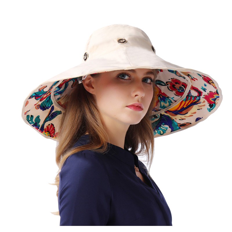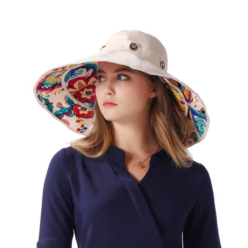 The hat is multi use convertible sunhat,the extra-wide brim is removable with button closure.You will love the fact that you can wear it as a normal sized hat or a huge floppy hat and wear it with the floral pattern on the outside or the inside. Such smart design enables you to complete any your outfit on any occasion only with this one hat. When you take off the large brim, it gives you plenty of mobility to be active (beach volleyball, running, tennis, etc), when you button the brim on, you can stay on the beach all the day!