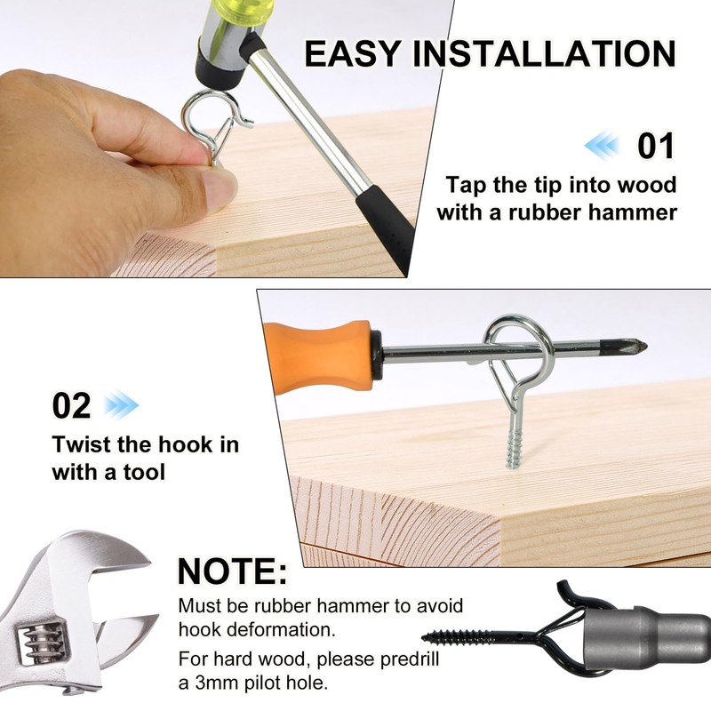 - These hooks are designed to adapt to any angle, with burr-free edges that protect your hands during installation. Their sharp threads easily penetrate wood, walls, ceilings, and fences. Pre-drilling is recommended for faster and easier installation.