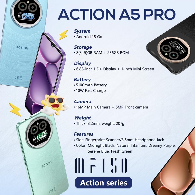 - 【6.88" HD+ Größeres Display & Ultra Slim - Nervenkitzel in Einem Eleganten】IIIF150 Action A5 Pro handy erleben eine unvergleichliche kinematische Vision mit einem 6.88" HD+ größeren Bildschirm (Auflösung: 1640x720), fortgeschrittene 450nit Helligkeit. Mit einem erstaunlich schlanken Profil von nur 8.2mm, Gewicht: 207g. IIIF150 Action A5 Pro smartphone präsentiert ein atemberaubend schlankes Design, das moderne Eleganz strahlt.