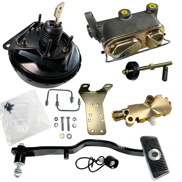 - Includes: 9” Black Mustang Booster w/ Firewall Plate;1" Bore Master Cylinder;Universal Disc Drum Proportioning Valve Kit;Disc/Drum Brake Pedal