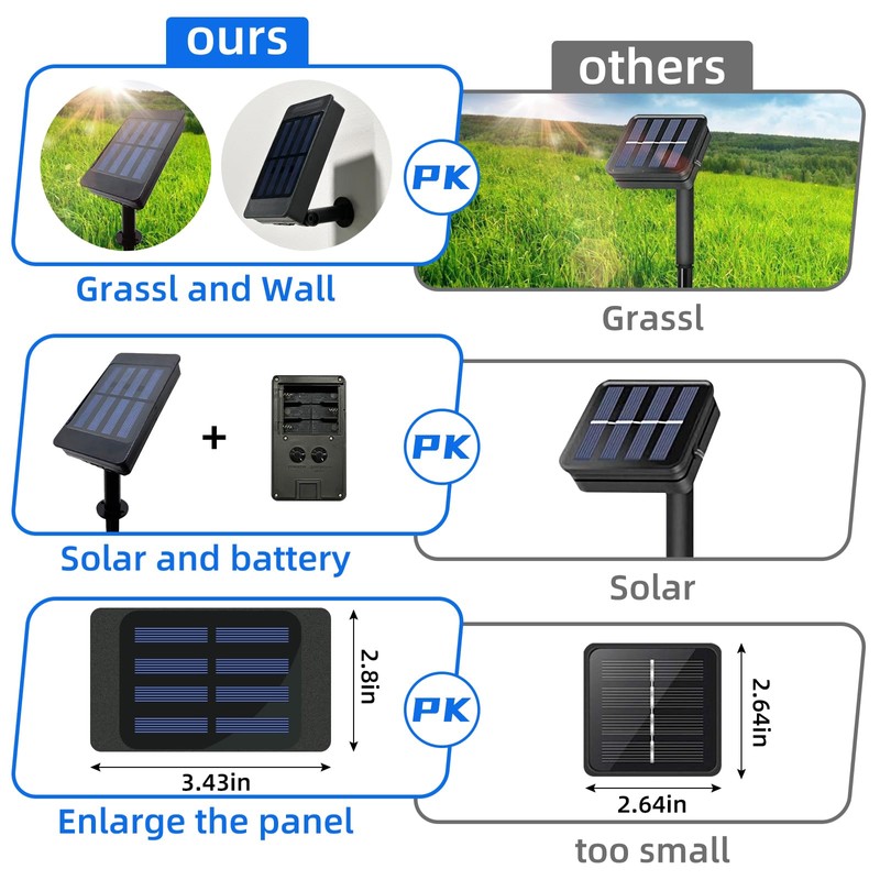 - 【Solar and Battery Powered】:Two kinds of power supply, solar string lights can be powered by 3 AA batteries when the solar panel is dead. For example, continuous rainy days, snowy days and so on. Don't worry about not being able to light up when there is no power! So you can enjoy the outdoor light show for a long time.
