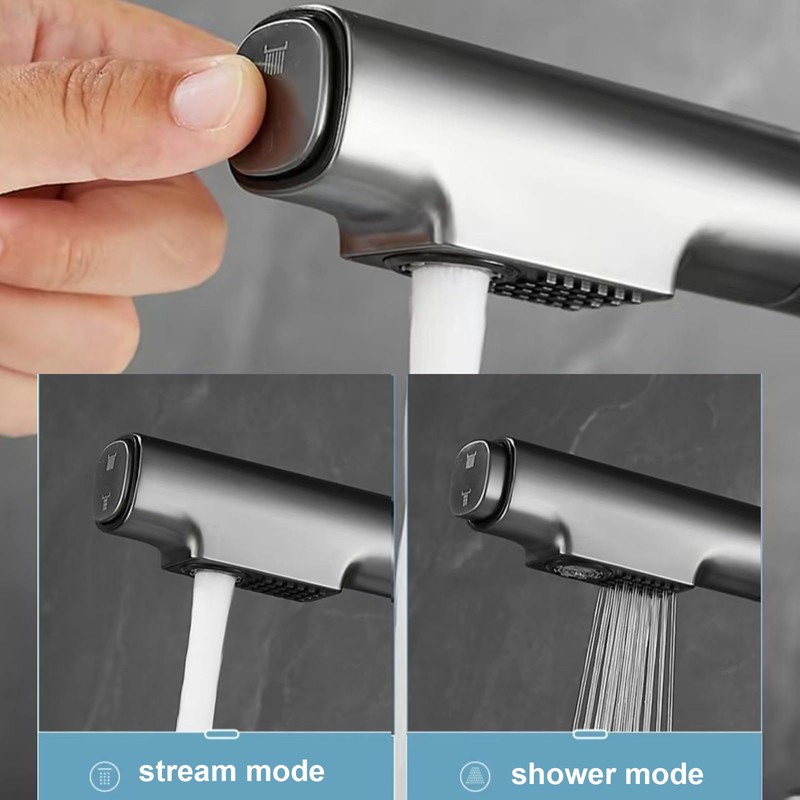 • 2 Function Basin Faucet: One key switch water outlet: Two-speed mode can be adjusted at will. Stream mode is prefect for filling pots and pans, sprayer mode is prefect for wide superior rinsing, facilitates various bathroom tasks. Single handle control water temperature and flow volume easily