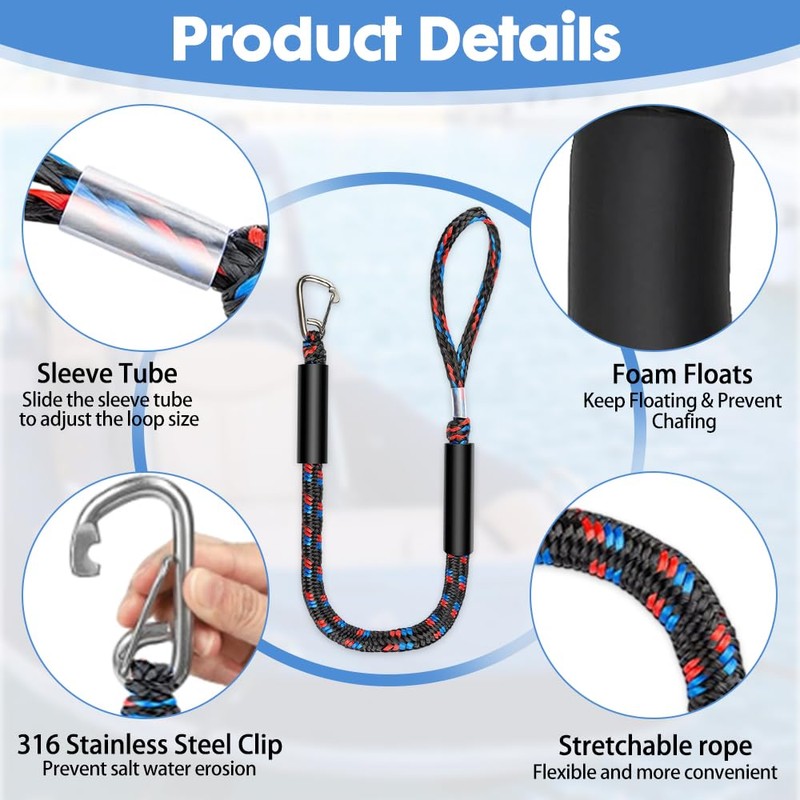 - ✅ VERSATILE The rope braided mooring line features an integrated elastic bungee cord that provides maximum shock absorption. Dock ropes are perfect for quickly and securely tying mooring lines, ideal temporary mooring lines for kayaks, motor boats, marinas, floating docks, whitewater rafting, water skiing, snowboarding, park boats and more.