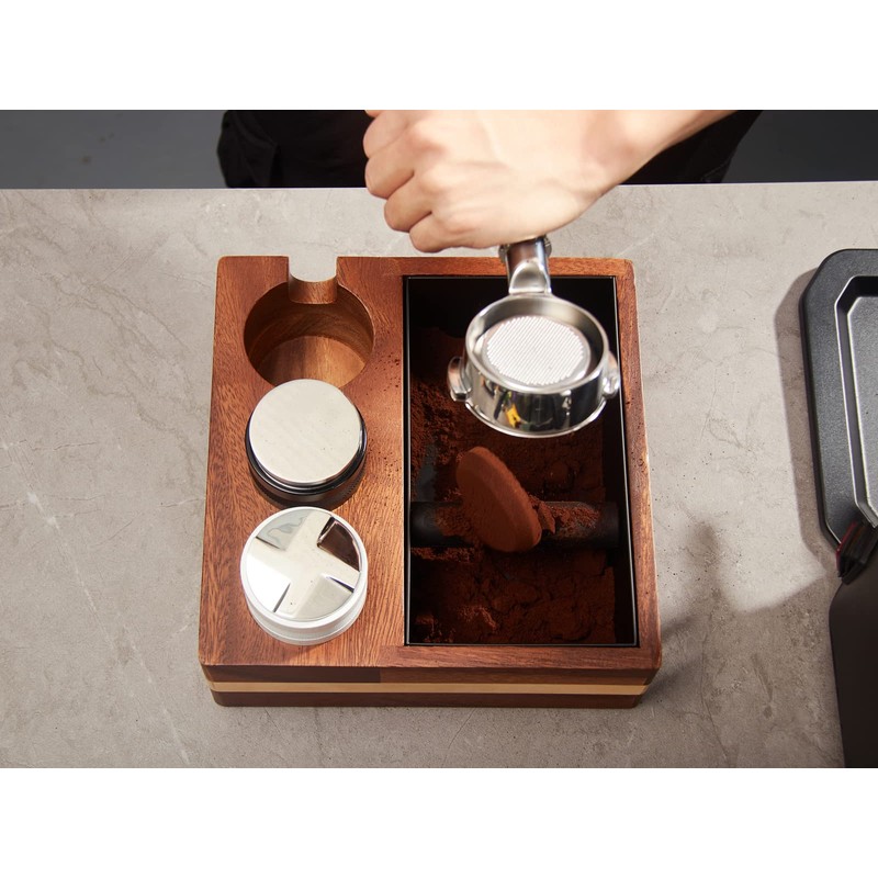 - 💖4-in-1 Organizer Box☕: Four-in-one espresso organizer includes espresso tamper holder, coffee distributor holder, 58mm portafilter basket holder, and knock box, which solves all your coffee storage worries. A stainless steel knocker box on the left side is freely removable.
