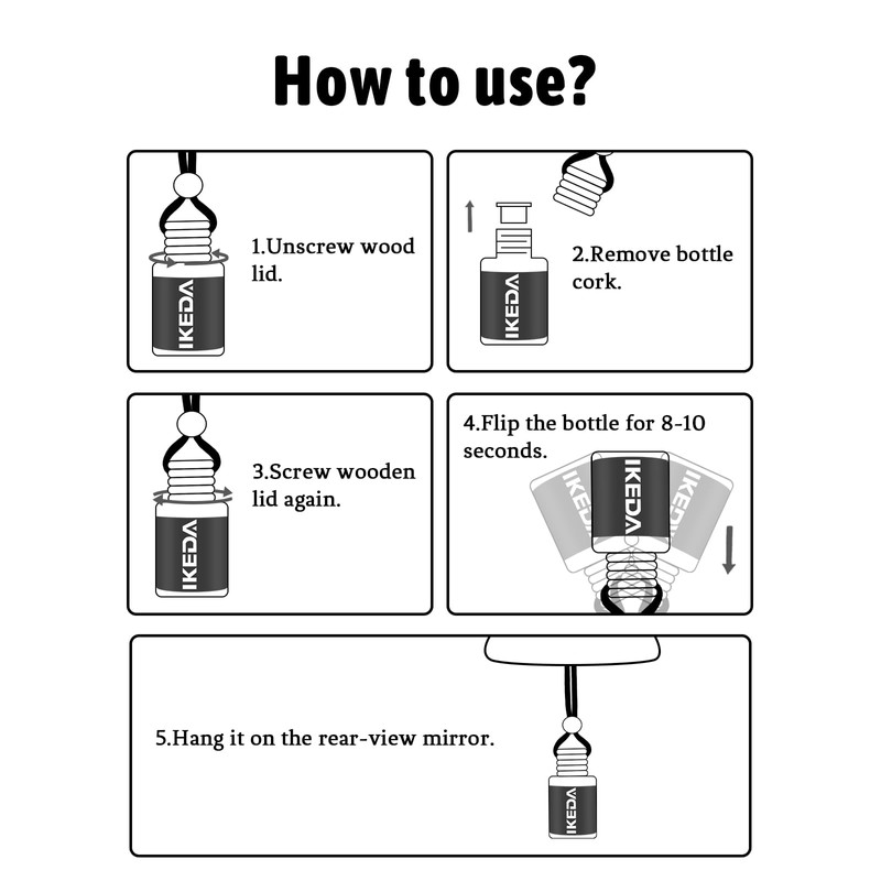 - Effortless Application: Enjoy hassle-free freshness with this easy-to-use car air freshener. Simply invert the bottle to saturate the lid with fragrance, then hang it in your desired location using the attached rope. Its user-friendly design requires no assembly or special tools, making it accessible to everyone. Whether you're a seasoned driver or new to car accessories, you'll appreciate the simplicity and effectiveness of this air freshener. Experience the instant freshness with just a few simple steps, and enjoy a pleasant driving or living environment every day.