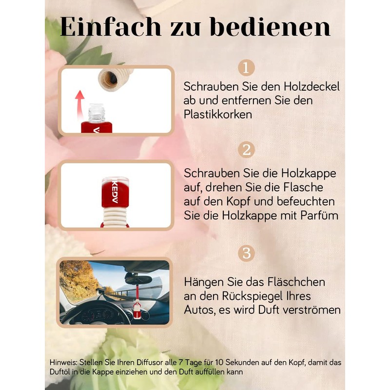 - EINFACH ZU BENUTZEN: Schrauben Sie einfach den Deckel ab und entfernen Sie den Plastikkorken; schrauben Sie den Deckel wieder auf; schtteln Sie die Flasche sanft, kippen Sie sie fr ein paar Sekunden auf den Kopf, um das Innere des Deckels zu tr?nken; stellen Sie das Seil und den Stopper ein, um die Verteilung des Duftes zu kontrollieren, es wird einen angenehmen Geruch durch ein Baumwollseil und einen h?lzernen Stopper abgeben; h?ngen Sie diesen Auto Duft Lufterfrischer berall auf.
