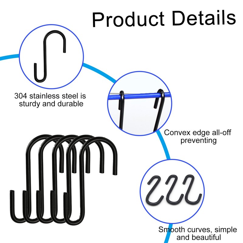 - S hooks stainless steel: The s-hooks heavy duty are made of stainless steel, which is robust and strong enough, feel durable and made to last. The shiny surface is corrosion-resistant and rust-proof, which can be used in high humidity environments such as outdoors, kitchen and bathroom. The s-hooks can safely hook the elements and do not slip easily.