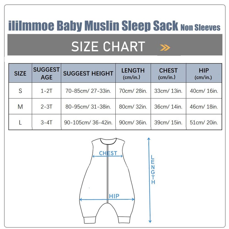 Frequently Asked Questions:1Q:Is it cotton?ililmmoe:It is 100%cotton2Q: Which size is good for my baby? ililmmoe: We recommend choosing sizes based on the height of your baby rather than the age . For example if your baby is 35 inch heigh, we suggest SIZE M.3.Q: What temperature is fit for wearing this sleeping sack?ililmmoe: Our muslin sleeping sack is light and breathable and is good between 65°F to 80°F of the sleeping temperature.