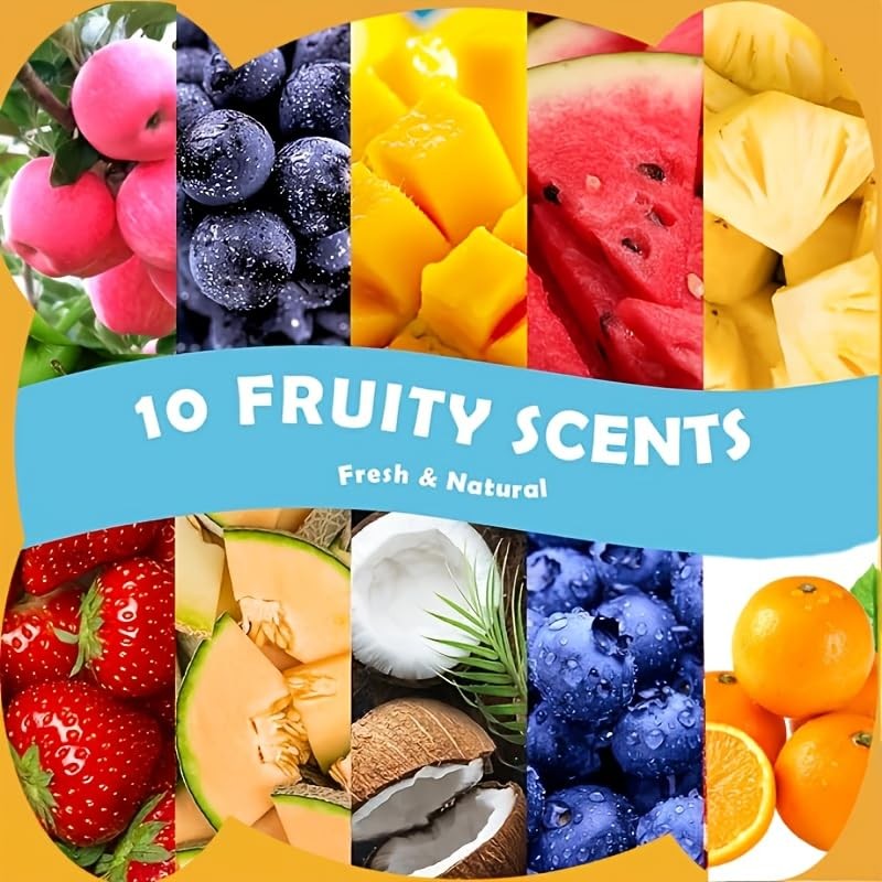 - 10 Fruity Fragrance Oils (10ML Pack); This premium scented oils set contains a series of summer fruits aroma - coconut, strawberry, mango, pineapple, cantaloupe, apple, orange, blueberry, watermelon, grape, fill your time with fresh fragrance