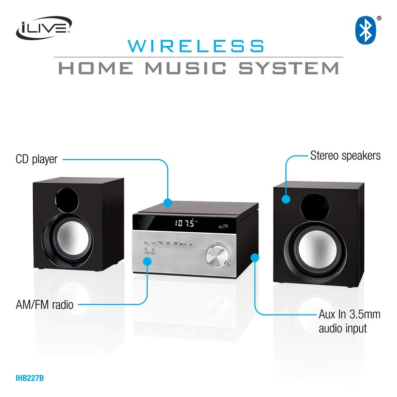iLive Electronics Wireless Home Stereo System, with CD Player and AM/FM Radio, Includes Remote Control (iHB227B),Black/Silver
