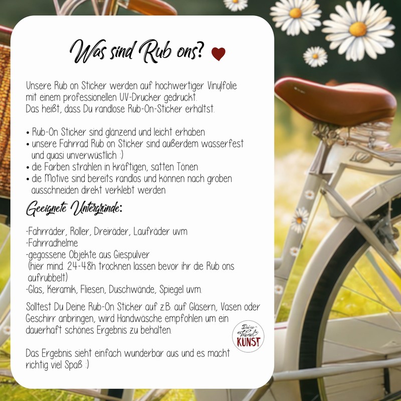 - Box contents and size: bicycle sticker Rub on Rubons horses. You will receive: 10 horse stickers + daisy rubons (sheet approx. 16 cm wide x 9 cm high)