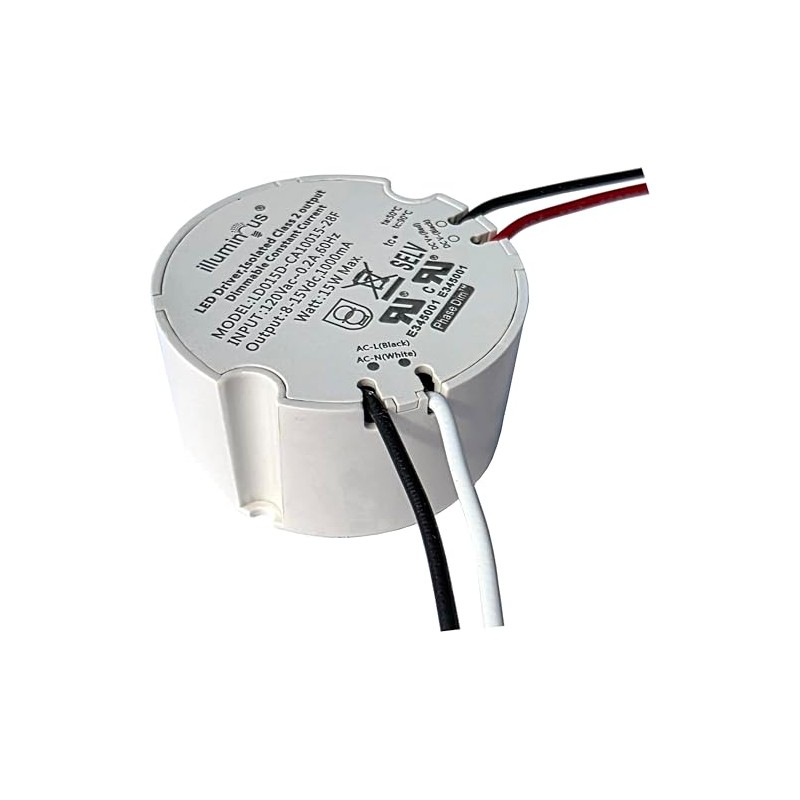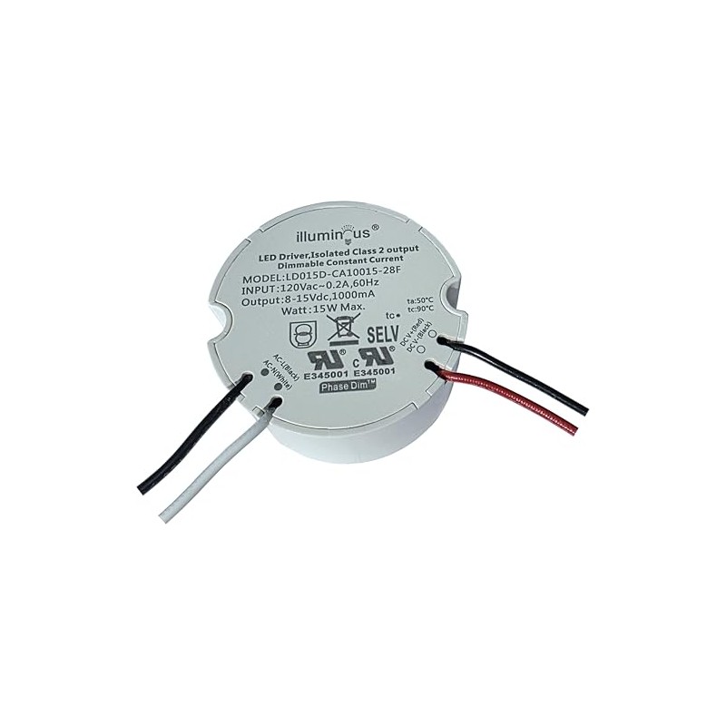 Transform your LED lighting setup with this versatile 15W DC LED driver. Operating on 120V AC input, this compact and lightweight driver delivers a reliable 1000mA constant current output, perfect for indoor LED applications. The driver features dimming compatibility with industry-standard Triac leading and trailing edge dimmers, including popular models like Lutron S-600P-AL. With built-in protection against short circuits, overload, and overheating, this unit ensures safe, reliable operation. The driver maintains excellent power factor correction above 0.9 and features low inrush current under 10A. Its compact size of 1.89" diameter by 0.98" height makes it ideal for space-constrained installations. The unit comes with 15cm fly leads and operates efficiently in temperatures from -20C to +65C. This UL and cUL approved driver is designed for LED arrays with forward voltage totaling under 15V when wired in series.