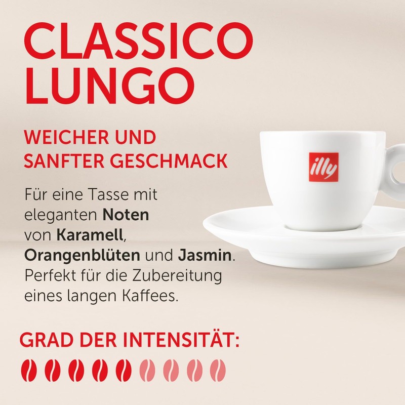 - CLASSICO LUNGO: Das CLASSICO Lungo-Röstprofil kombiniert zarte Aromen von Karamell, Schokolade und geröstetem Brot mit einem süßen Finish; speziell für einen lang anhaltenden Kaffeegenuss entwickelt