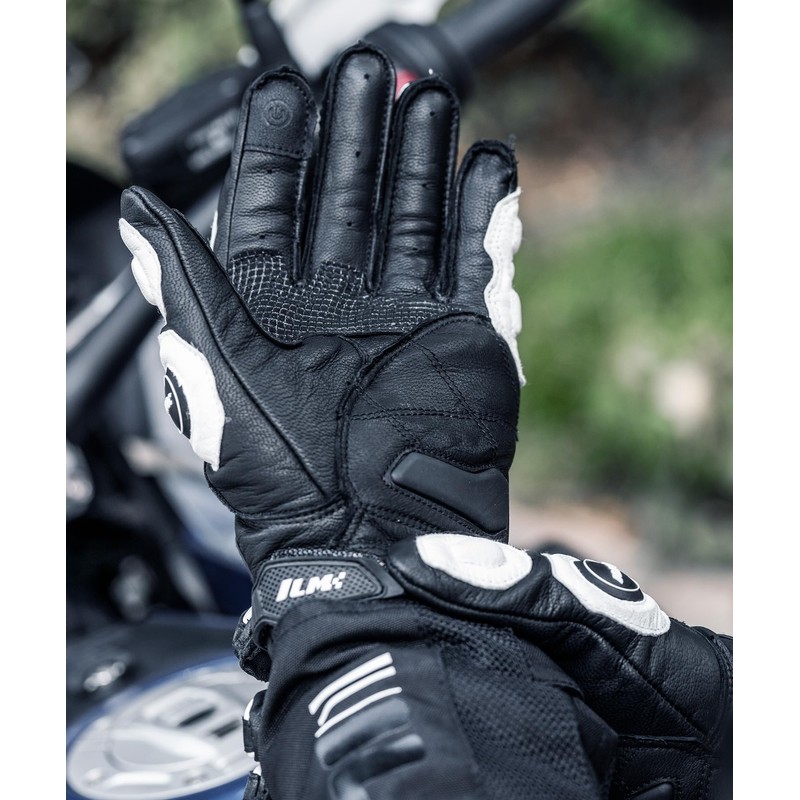 • Multiple Reinforcements: Made with doubled leather layer and additional foam on areas exposed to abrasion in a crash situation (palm, cuff, fingers). The positionning of these elements has been designed to protect hands from shocks but also from long abrasions on tarmac
