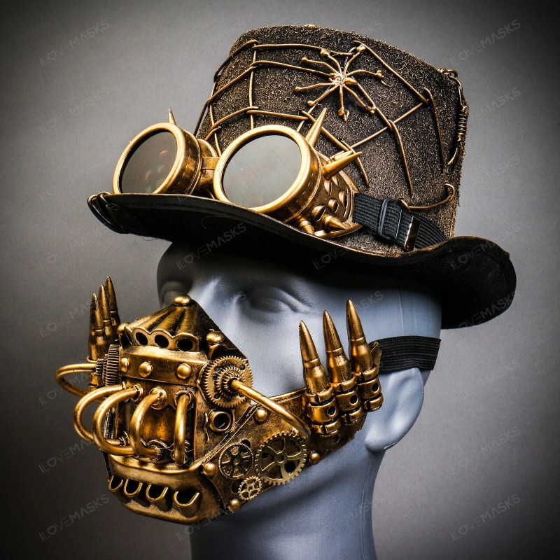ILOVEMASKS Gold Halloween Spider Web Top Hat w/ Gold Robot Mask & Spike Goggles Costume