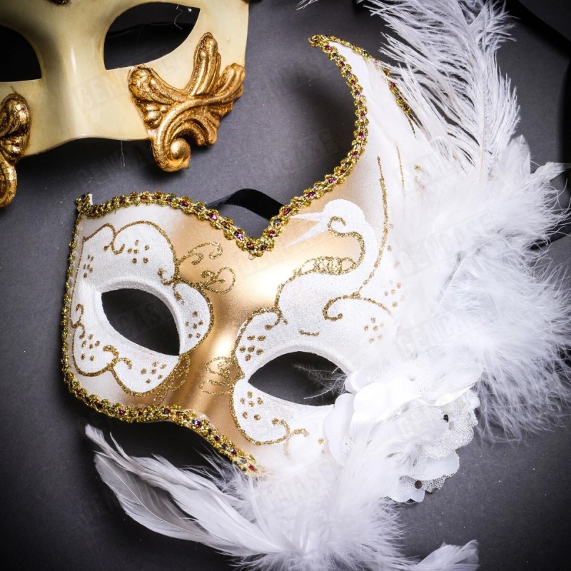 iLoveMasks His & Her Gold White Party Masquerade Masks Set for Couple Venetian Feather Mask