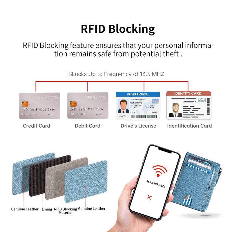 - 【High- Quality】 - This slim RFID wallet is made from genuine leather and does not have any unpleasant odor. The interior features RFID-blocking material, safeguarding your personal information from theft. The high-quality zippers glide smoothly, promising a hassle-free experience.