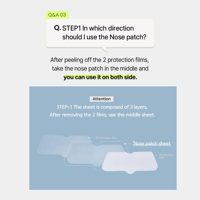 1. After washing your face, apply STEP-1 on your nose area. After 10-15 minutes, remove the nose sheet and gently remove the visible blackheads and sebum with a cotton swab, then lightly rinse off with warm water. 2. Apply STEP-2 sheet to your nose area, and then peel it off after 15-20 minutes. Gently pat the remaining essence on skin for better hydration of your skin.