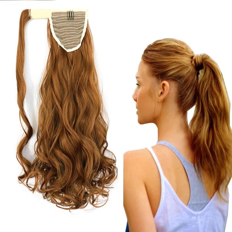 iLUU Fashion Curly Wavy Wrap Around Ponytail Extension 18" Long Length Synthetic Hair Extensions #27A Blonde Womens Clip in Ponytail 100g for Women Girl